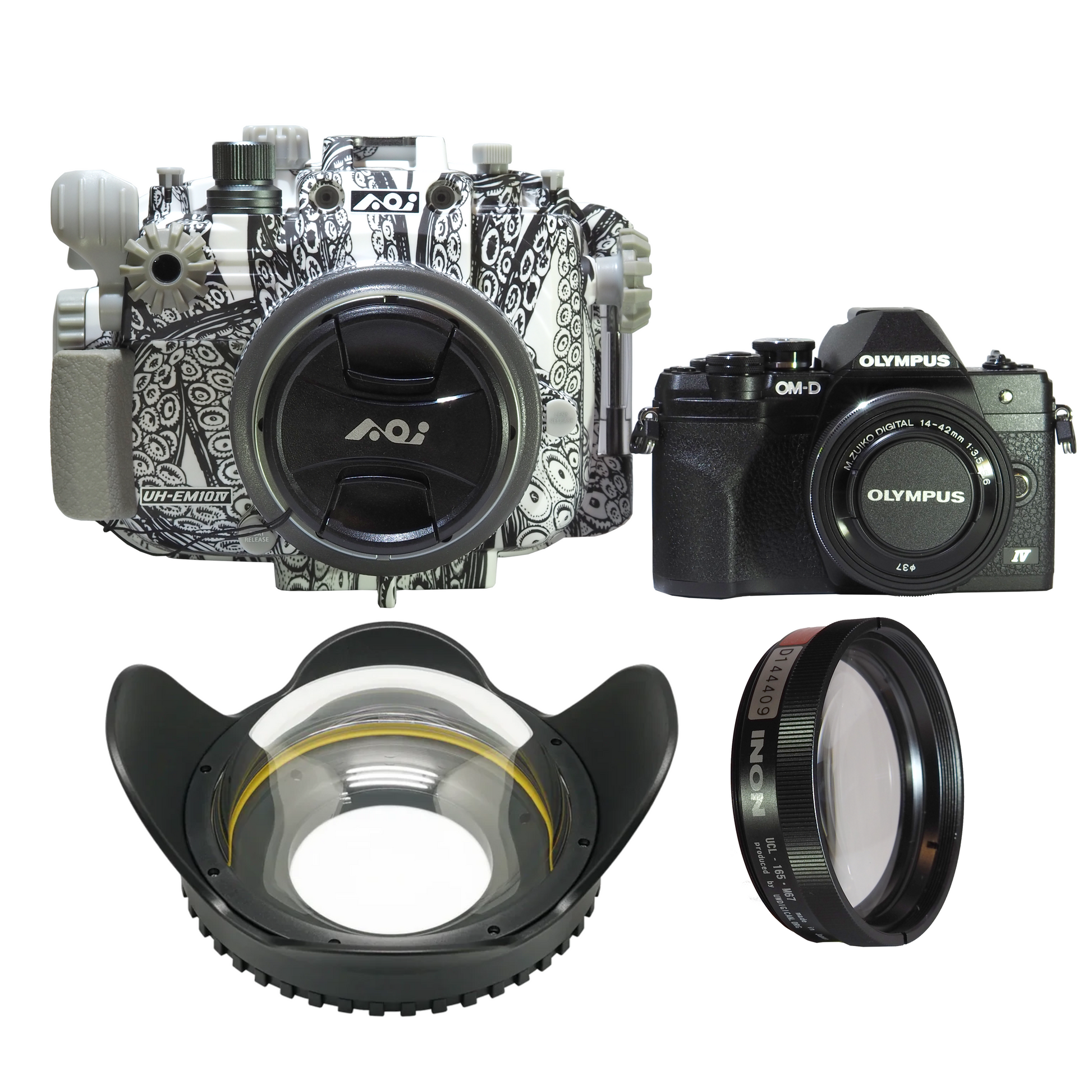 This is a package which includes the OM System OM-D EM10 IV camera, the Backscatter housing designed for it, an air lens dome which restores the full angle of view for the land lens when underwater an Inon UCL-165 67mm "wet" macro lens.